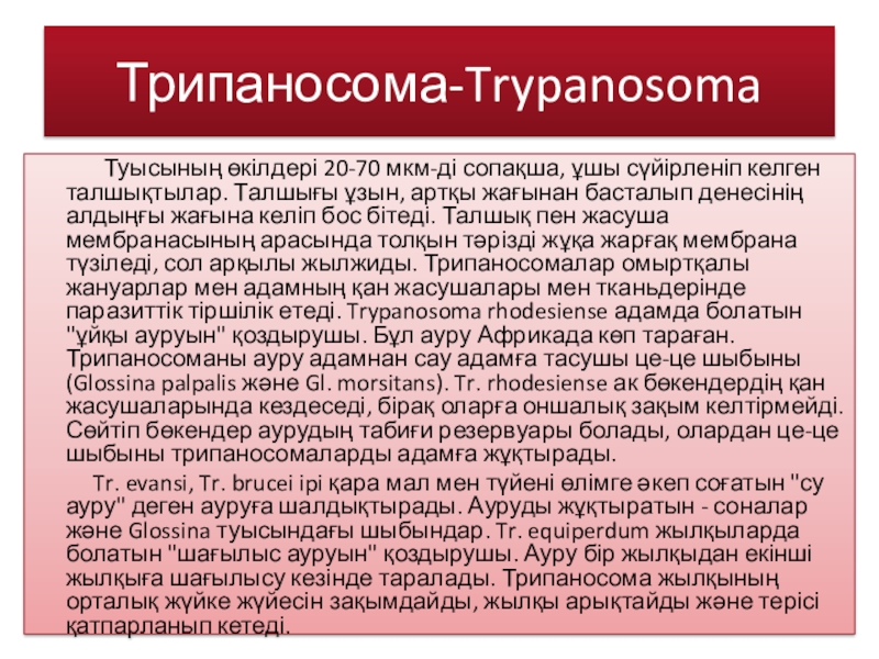 сопақша, ұшы сүйірленіп келген талшықтылар. Талшығы ұзын, артқы жағынан басталып денесінің алдыңғы жағына келіп бос бітеді. Талшық пен жасуша мембранасының арасында толқын тәрізді жұқа жарғақ мембрана түзіледі, сол арқылы жылжиды. Трипаносомалар омыртқалы жануарлар мен адамның қан жасушалары мен тканьдерінде паразиттік тіршілік етеді. Trypanosoma rhodesiense адамда болатын "ұйқы ауруын" қоздырушы. Бұл ауру Африкада көп тараған. Трипаносоманы ауру адамнан сау адамға тасушы це-це шыбыны (Glossina palpalis және Gl. morsitans). Tr. rhodesiense ак бөкендердің қан жасушаларында кездеседі, бірақ оларға оншалық зақым келтірмейді. Сөйтіп бөкендер аурудың табиғи резервуары болады, олардан це-це шыбыны трипаносомаларды адамға жұқтырады.