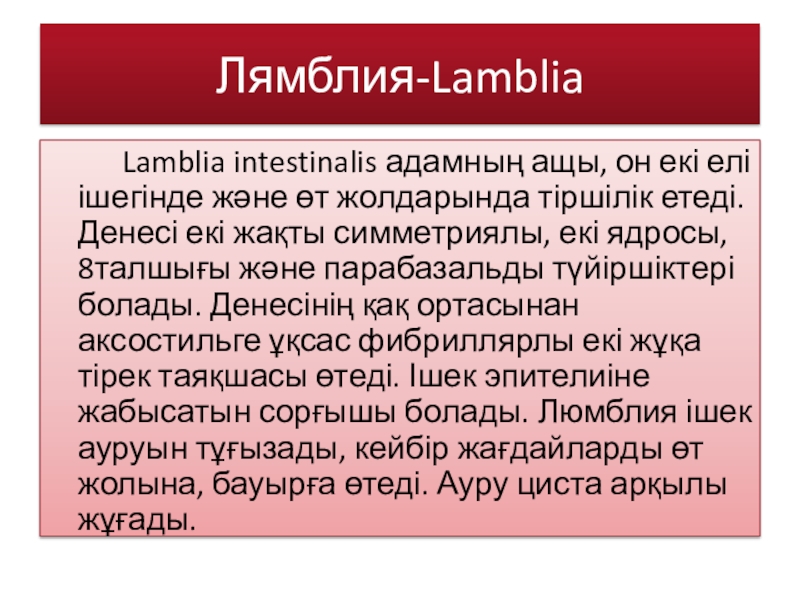 елі ішегінде және өт жолдарында тіршілік етеді. Денесі екі жақты симметриялы, екі ядросы, 8талшығы және парабазальды түйіршіктері болады. Денесінің қақ ортасынан аксостильге ұқсас фибриллярлы екі жұқа тірек таяқшасы өтеді. Ішек эпителиіне жабысатын сорғышы болады. Люмблия ішек ауруын тұғызады, кейбір жағдайларды өт жолына, бауырға өтеді. Ауру циста арқылы жұғады.