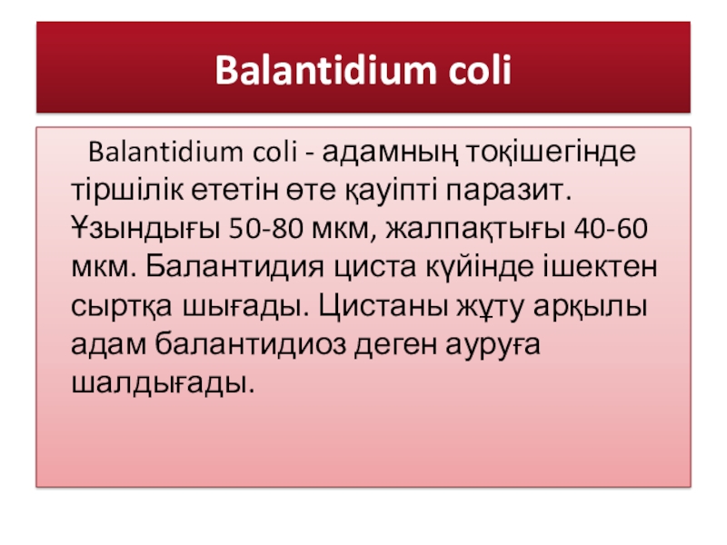 өте қауіпті паразит. Ұзындығы 50-80 мкм, жалпақтығы 40-60 мкм. Балантидия циста күйінде ішектен сыртқа шығады. Цистаны жұту арқылы адам балантидиоз деген ауруға шалдығады.