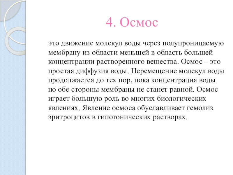 области меньшей в область большей концентрации растворенного вещества. Осмос – это простая диффузия воды. Перемещение молекул воды продолжается до тех пор, пока концентрация воды по обе стороны мембраны не станет равной. Осмос играет большую роль во многих биологических явлениях. Явление осмоса обуславливает гемолиз эритроцитов в гипотонических растворах.