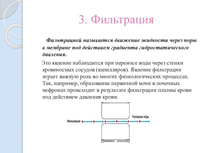 Это явление наблюдается при переносе воды через стенки кровеносных сосудов (капилляров). Явление фильтрации играет важную роль во многих физиологических процессах. Так, например, образование первичной мочи в почечных нефронах происходит в результате фильтрации плазмы крови под действием давления крови.