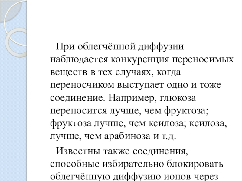 Слайд 18 При облегчённой диффузии наблюдается конкуренция переносимых веществ в