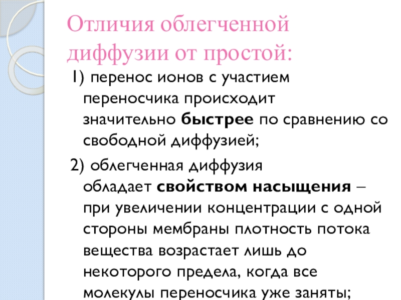 Слайд 2Отличия облегченной диффузии от простой: