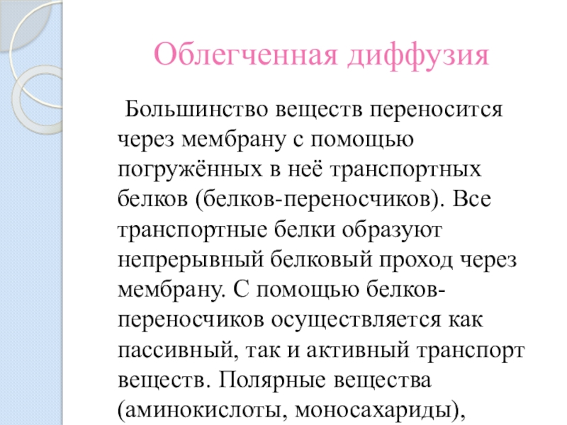 в неё транспортных белков (белков-переносчиков). Все транспортные белки образуют непрерывный белковый проход через мембрану. С помощью белков-переносчиков осуществляется как пассивный, так и активный транспорт веществ. Полярные вещества (аминокислоты, моносахариды), заряженные частицы (ионы) проходят через мембраны с помощью облегченной диффузии, при участии белков-каналов или белков-переносчиков. Участие белков-переносчиков обеспечивает более высокую скорость облегченной диффузии по сравнению с простой пассивной диффузией.