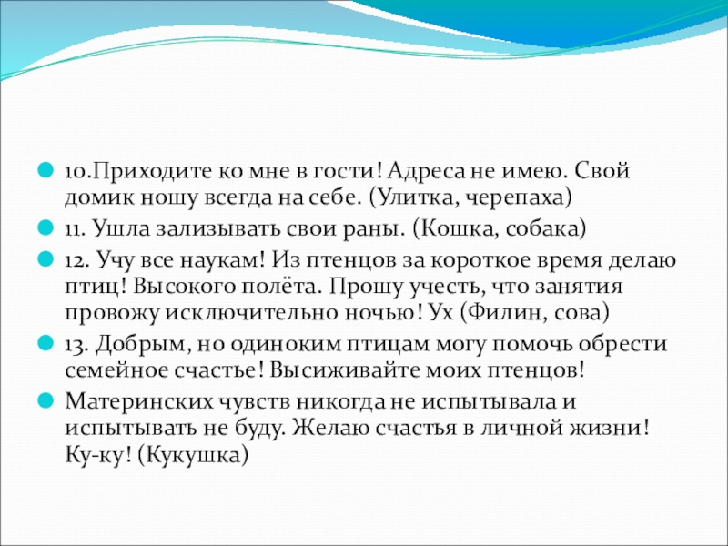 10.Приходите ко мне в гости! Адреса не имею. Свой домик ношу всегда на себе. (Улитка, черепаха)11. Ушла
