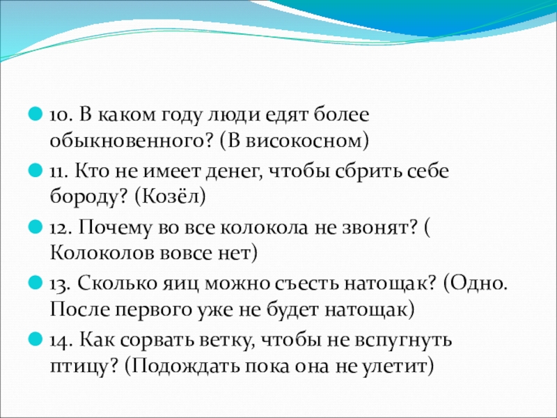 10. В каком году люди едят более обыкновенного? (В високосном)11. Кто не имеет денег, чтобы сбрить себе