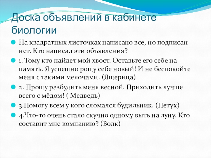 Доска объявлений в кабинете биологииНа квадратных листочках написано все, но подписан нет. Кто написал эти объявления?1. Тому кто найдет мой хвост. Оставьте его себе на память. Я успешно рощу себе новый! И не беспокойте меня с