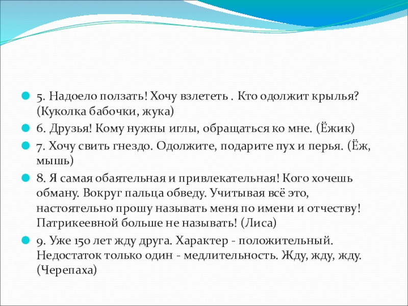 8. Я самая обаятельная и привлекательная! Кого хочешь обману. Вокруг пальца обведу. Учитывая всё это, настоятельно прошу называть меня по имени и отчеству! Патрикеевной больше не называть! (Лиса)