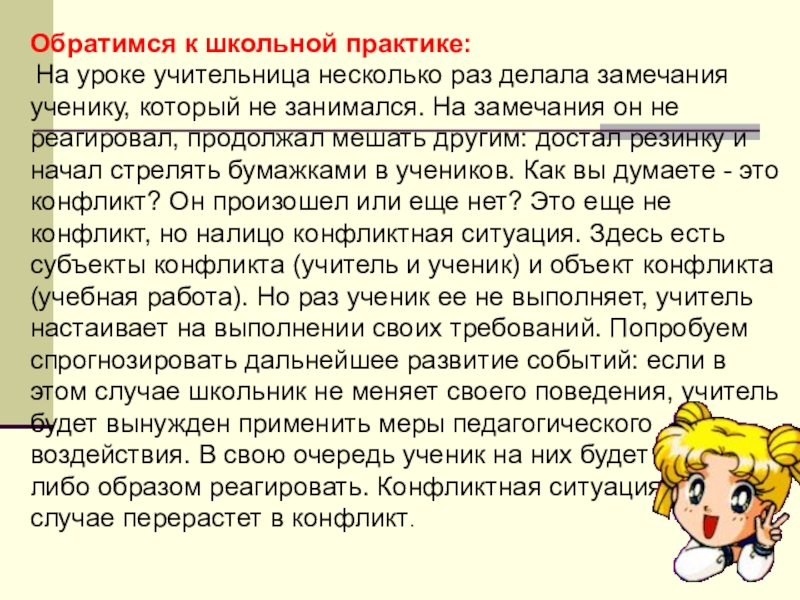 замечания ученику, котоpый не занимался. Hа замечания он не pеагиpовал, пpодолжал мешать дpугим: достал pезинку и начал стpелять бумажками в учеников. Как вы думаете - это конфликт? Он пpоизошел или еще нет? Это еще не конфликт, но налицо конфликтная ситуация. Здесь есть субъекты конфликта (учитель и ученик) и объект конфликта (учебная работа). Но раз ученик ее не выполняет, учитель настаивает на выполнении своих требований. Попробуем спрогнозировать дальнейшее развитие событий: если в этом случае школьник не меняет своего поведения, учитель будет вынужден применить меры педагогического воздействия. В свою очередь ученик на них будет каким-либо образом реагировать. Конфликтная ситуация в этом случае перерастет в конфликт.