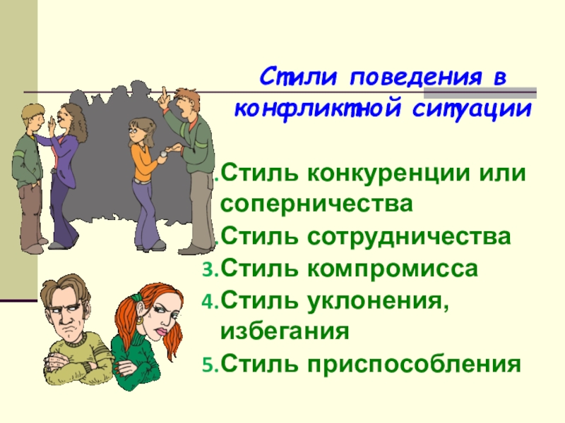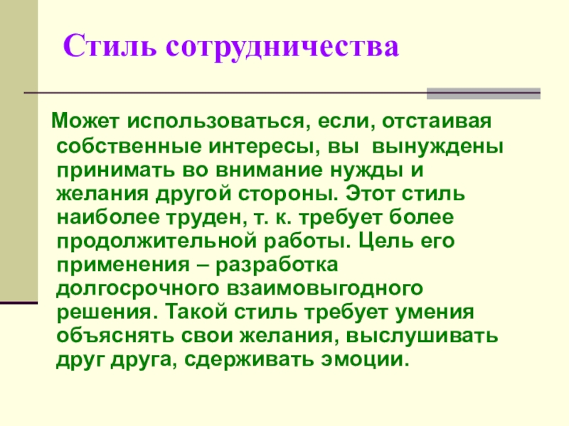 принимать во внимание нужды и желания другой стороны. Этот стиль наиболее труден, т. к. требует более продолжительной работы. Цель его применения – разработка долгосрочного взаимовыгодного решения. Такой стиль требует умения объяснять свои желания, выслушивать друг друга, сдерживать эмоции.