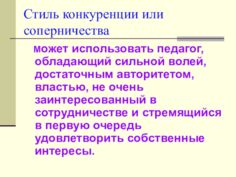 волей, достаточным авторитетом, властью, не очень заинтересованный в сотрудничестве и стремящийся в первую очередь удовлетворить собственные интересы.