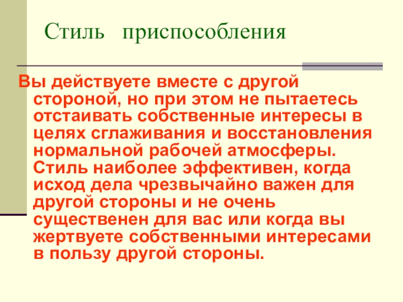 этом не пытаетесь отстаивать собственные интересы в целях сглаживания и восстановления нормальной рабочей атмосферы. Стиль наиболее эффективен, когда исход дела чрезвычайно важен для другой стороны и не очень существенен для вас или когда вы жертвуете собственными интересами в пользу другой стороны.