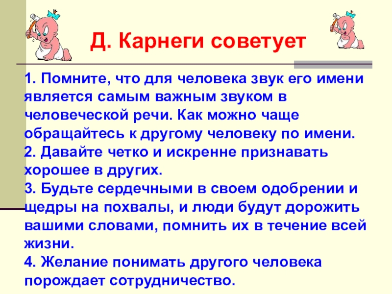 имени является самым важным звуком в человеческой речи. Как можно чаще обращайтесь к другому человеку по имени.