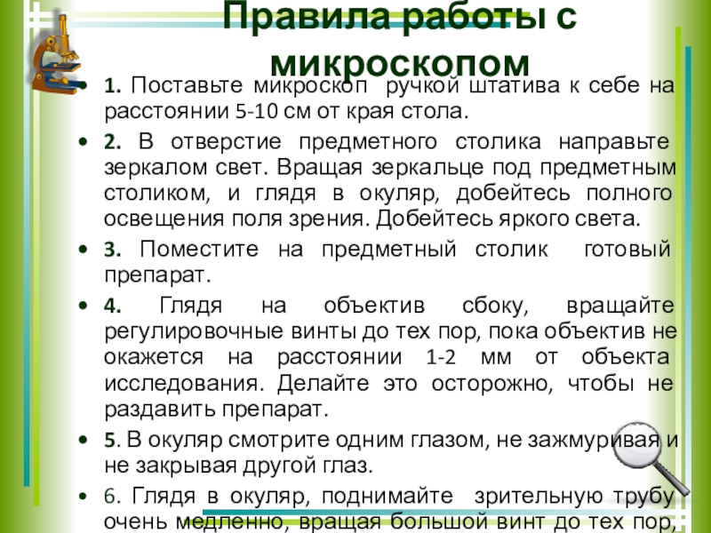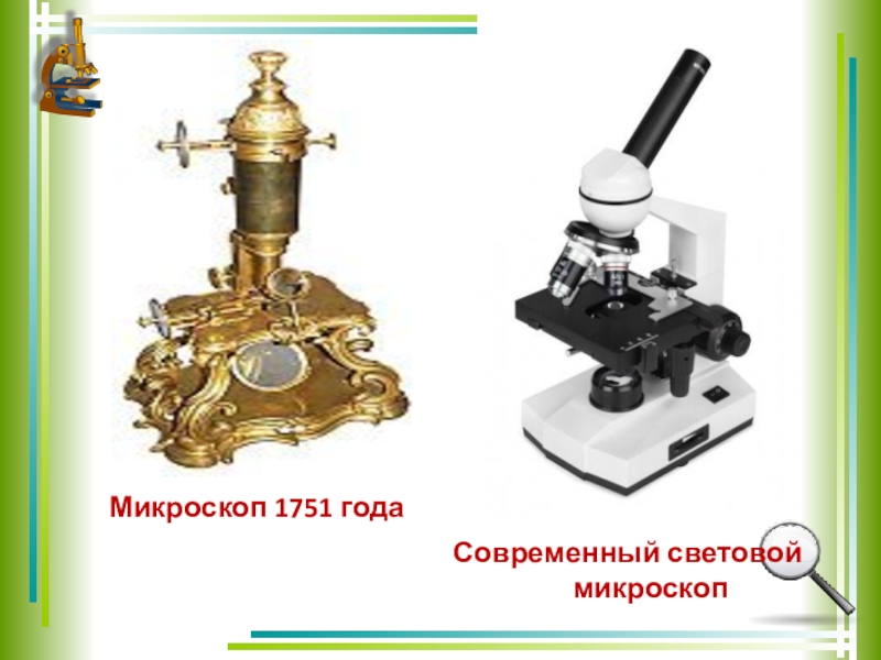 Современный микроскоп устроен относительно просто. Мы смотрим в верхнюю часть трубы, в которую вставлены увеличительные стёкла, а внизу находится предмет, который мы рассматриваем.