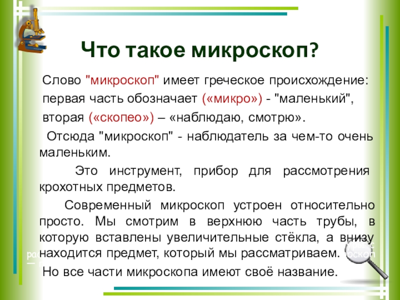 Отсюда "микроскоп" - наблюдатель за чем-то очень маленьким.