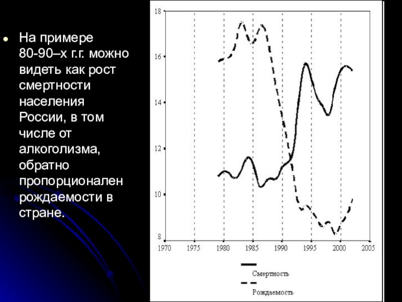 Слайд 15На примере 80-90–х г.г. можно видеть как рост смертности населения России,