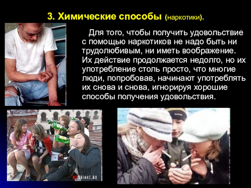 удовольствие с помощью наркотиков не надо быть ни трудолюбивым, ни иметь воображение. Их действие продолжается недолго, но их употребление столь просто, что многие люди, попробовав, начинают употреблять их снова и снова, игнорируя хорошие способы получения удовольствия.