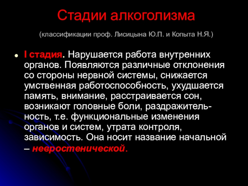 работа внутренних органов. Появляются различные отклонения со стороны нервной системы, снижается умственная работоспособность, ухудшается память, внимание, расстраивается сон, возникают головные боли, раздражитель-ность, т.е. функциональные изменения органов и систем, утрата контроля, зависимость. Она носит название начальной – невростенической.