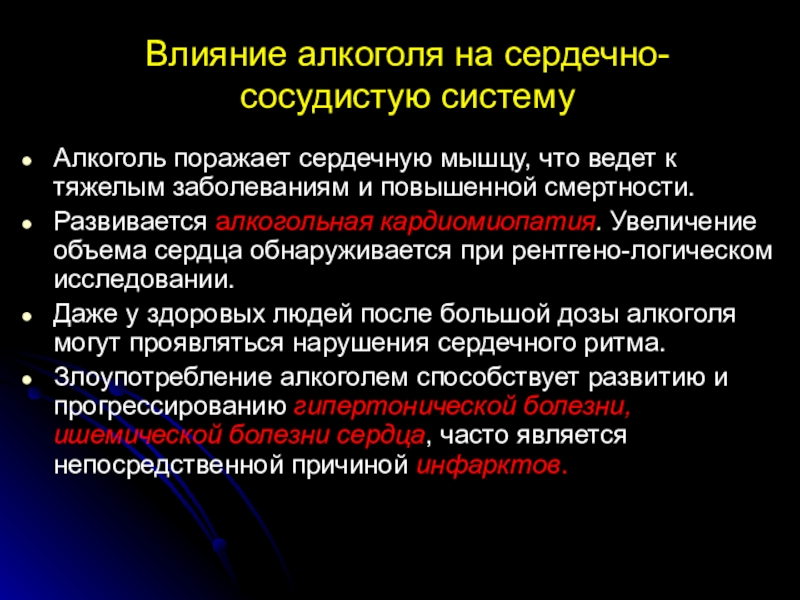Злоупотребление алкоголем способствует развитию и прогрессированию гипертонической болезни, ишемической болезни сердца, часто является непосредственной причиной инфарктов.