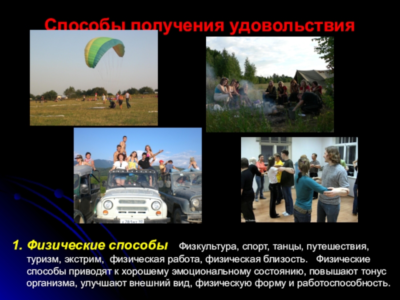 1. Физические способы Физкультура, спорт, танцы, путешествия, туризм,