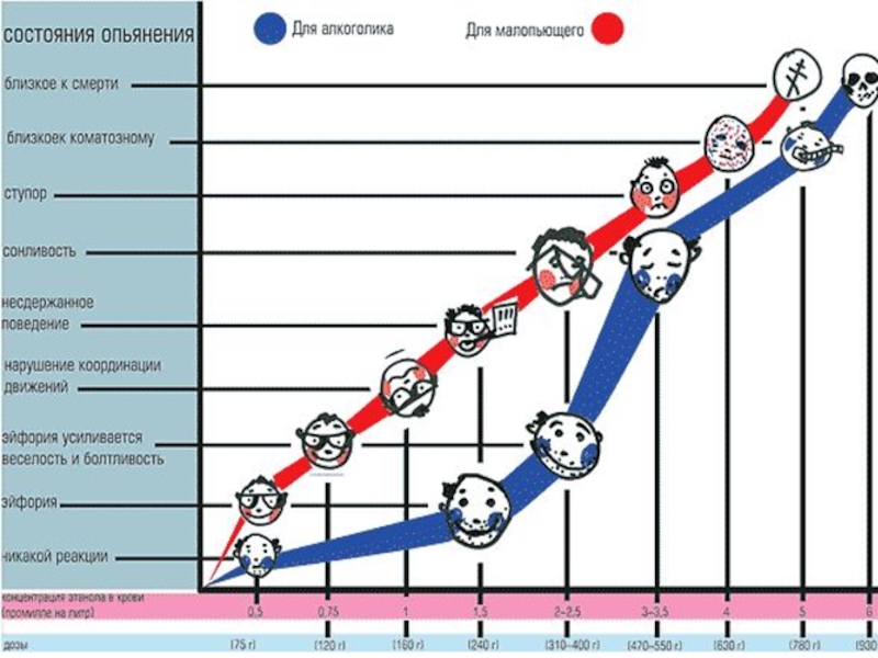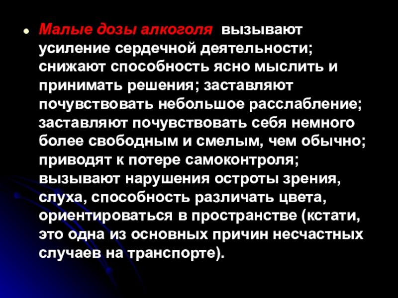 и принимать решения; заставляют почувствовать небольшое расслабление; заставляют почувствовать себя немного более свободным и смелым, чем обычно; приводят к потере самоконтроля; вызывают нарушения остроты зрения, слуха, способность различать цвета, ориентироваться в пространстве (кстати, это одна из основных причин несчастных случаев на транспорте).