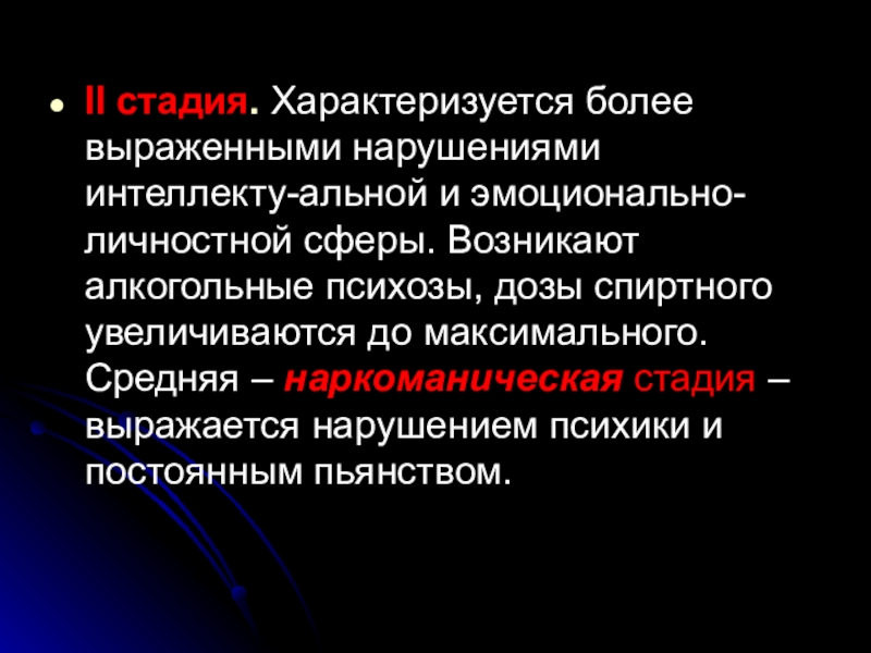 Слайд 54II стадия. Характеризуется более выраженными нарушениями интеллекту-альной и эмоционально-личностной сферы. Возникают