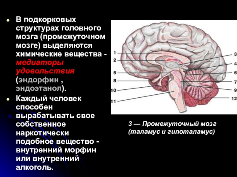 Слайд 23В подкорковых структурах головного мозга (промежуточном мозге) выделяются химические вещества -