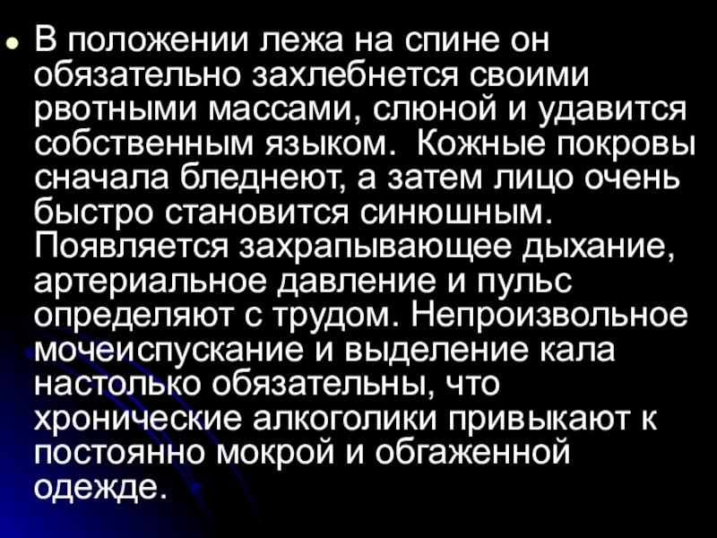 слюной и удавится собственным языком. Кожные покровы сначала бледнеют, а затем лицо очень быстро становится синюшным. Появляется захрапывающее дыхание, артериальное давление и пульс определяют с трудом. Непроизвольное мочеиспускание и выделение кала настолько обязательны, что хронические алкоголики привыкают к постоянно мокрой и обгаженной одежде.