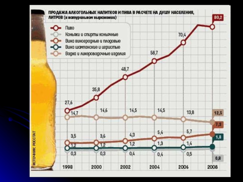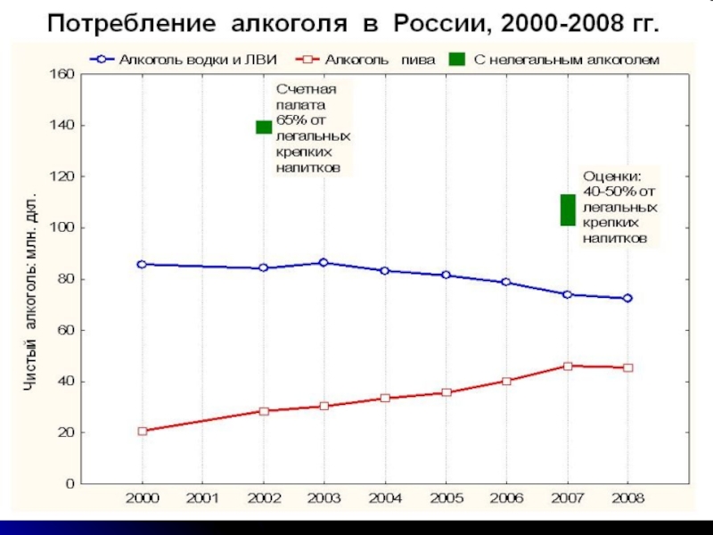 и реклама пива и алкогольных напитков, социальная, экономическая и психологическая напряженность, неорганизованность или дороговизна нормального досуга и отдыха способствуют росту алкоголизации населения России.