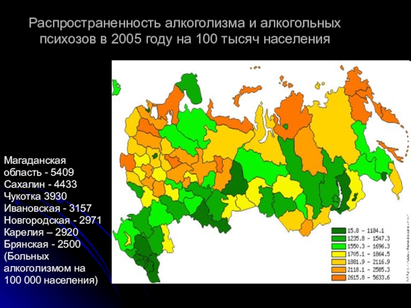 Слайд 8Распространенность алкоголизма и алкогольных психозов в 2005 году на 100 тысяч