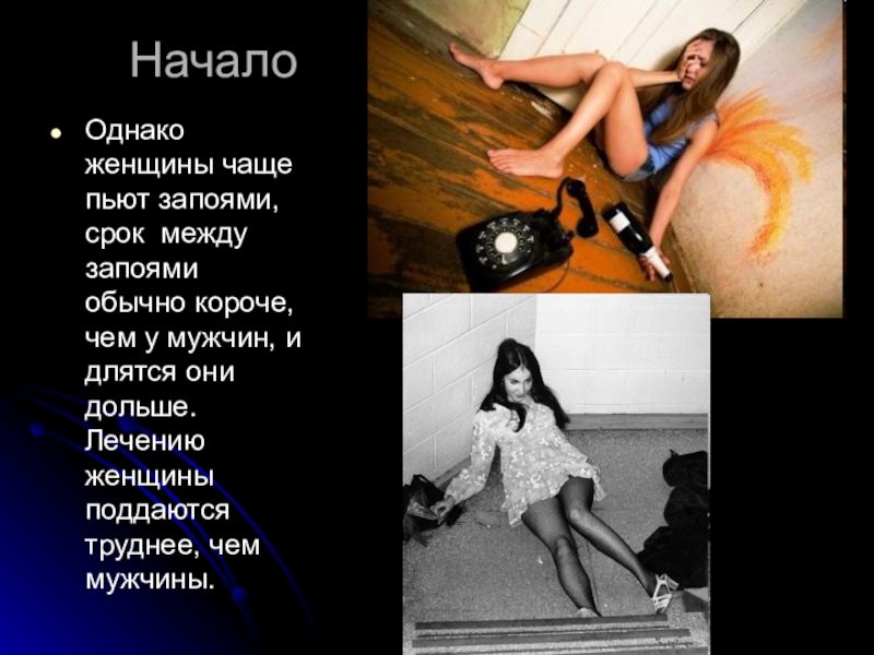 Однако женщины чаще пьют запоями, срок между запоями обычно короче, чем