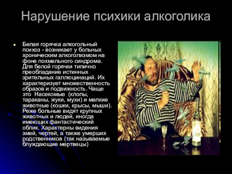 алкоголизмом на фоне похмельного синдрома. Для белой горячки типично преобладание истинных зрительных галлюцинаций. Их характеризует множественность образов и подвижность. Чаще это Насекомые (клопы, тараканы, жуки, мухи) и мелкие животные (кошки, крысы, мыши). Реже больные видят крупных животных и людей, иногда имеющих фантастический облик. Характерны видения змей, чертей, а также умерших родственников (так называемые блуждающие мертвецы)
