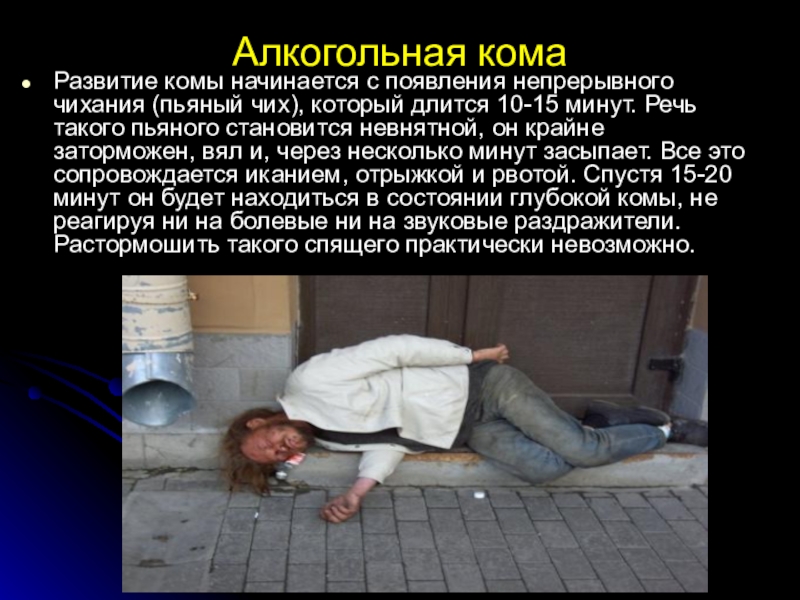 длится 10-15 минут. Речь такого пьяного становится невнятной, он крайне заторможен, вял и, через несколько минут засыпает. Все это сопровождается иканием, отрыжкой и рвотой. Спустя 15-20 минут он будет находиться в состоянии глубокой комы, не реагируя ни на болевые ни на звуковые раздражители. Растормошить такого спящего практически невозможно.
