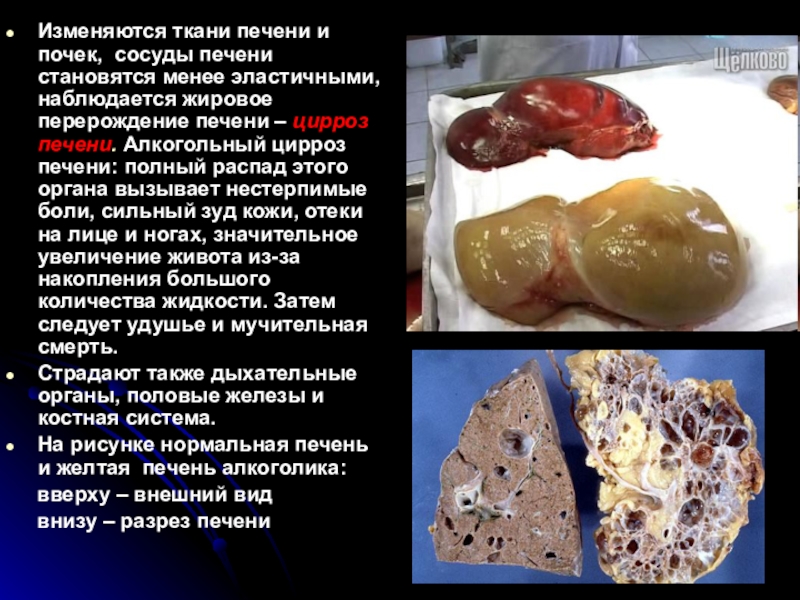 На рисунке нормальная печень и желтая печень алкоголика: