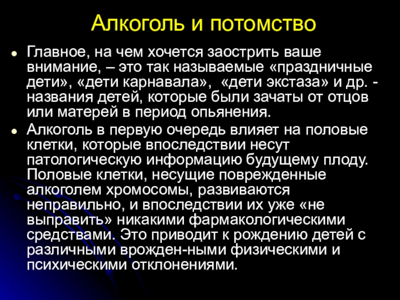 Алкоголь в первую очередь влияет на половые клетки, которые впоследствии несут патологическую информацию будущему плоду. Половые клетки, несущие поврежденные алкоголем хромосомы, развиваются неправильно, и впоследствии их уже «не выправить» никакими фармакологическими средствами. Это приводит к рождению детей с различными врожден-ными физическими и психическими отклонениями.