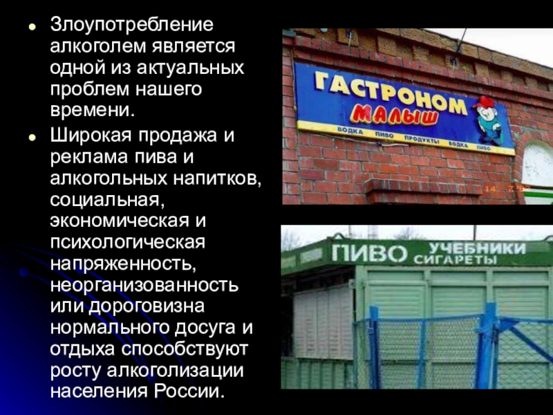 Слайд 6Злоупотребление алкоголем является одной из актуальных проблем нашего времени.