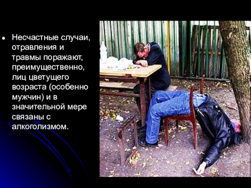 Слайд 10Несчастные случаи, отравления и травмы поражают, преимущественно, лиц цветущего возраста (особенно