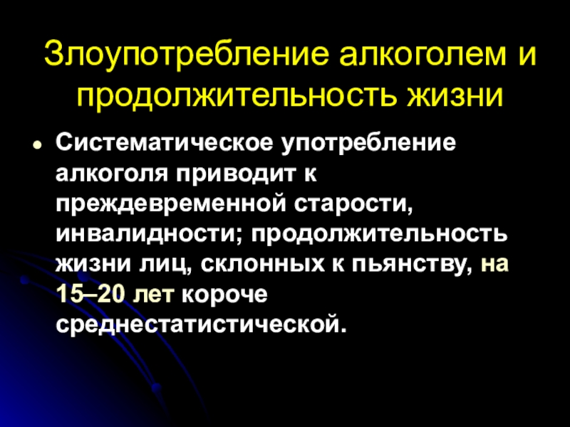 инвалидности; продолжительность жизни лиц, склонных к пьянству, на 15–20 лет короче среднестатистической.