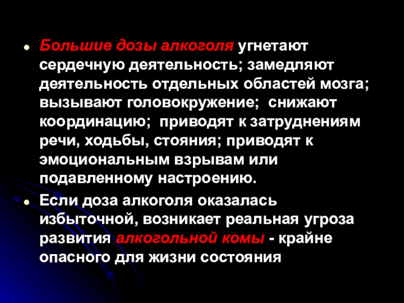 Слайд 49Большие дозы алкоголя угнетают сердечную деятельность; замедляют деятельность отдельных областей мозга;