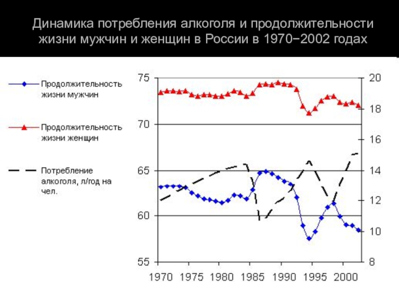 Слайд 16Динамика потребления алкоголя и продолжительности жизни мужчин и женщин в России
