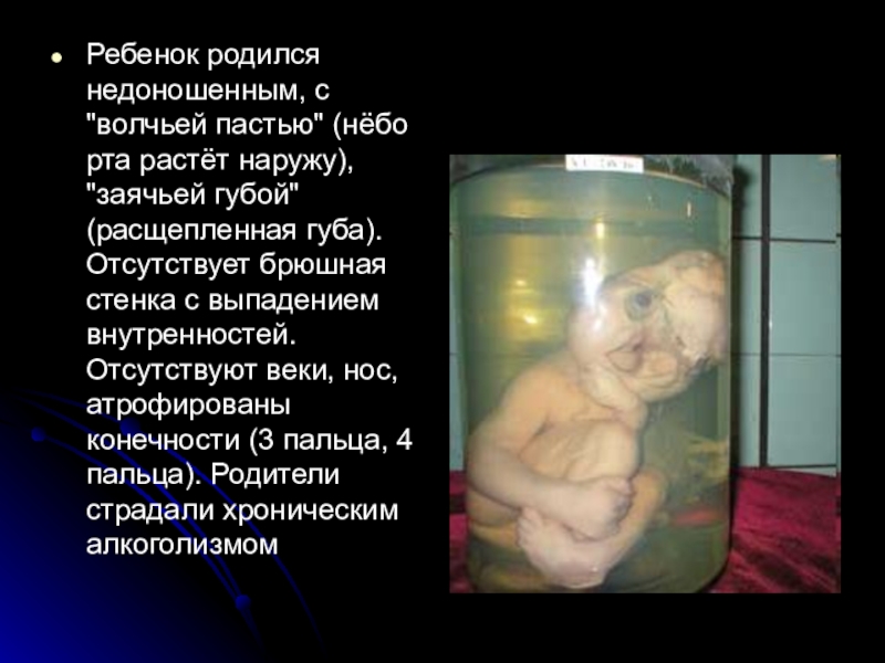 губой" (расщепленная губа). Отсутствует брюшная стенка с выпадением внутренностей. Отсутствуют веки, нос, атрофированы конечности (3 пальца, 4 пальца). Родители страдали хроническим алкоголизмом