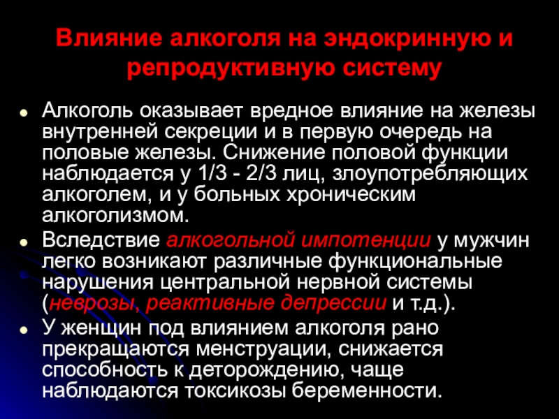Слайд 36Влияние алкоголя на эндокринную и репродуктивную систему