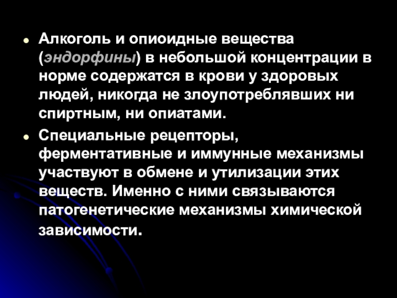 Слайд 24Алкоголь и опиоидные вещества (эндорфины) в небольшой концентрации в норме содержатся