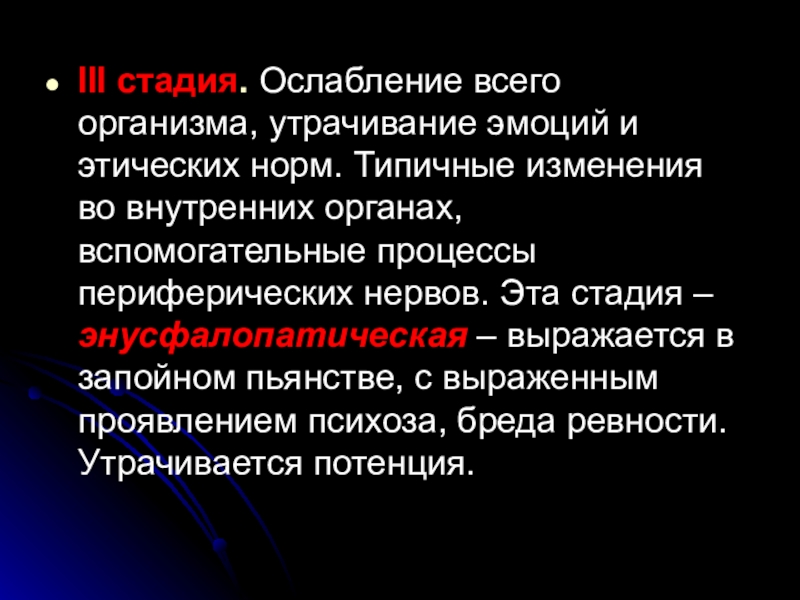 изменения во внутренних органах, вспомогательные процессы периферических нервов. Эта стадия – энусфалопатическая – выражается в запойном пьянстве, с выраженным проявлением психоза, бреда ревности. Утрачивается потенция.