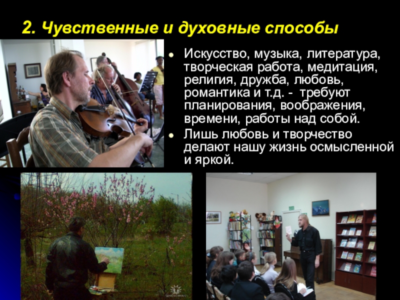 Слайд 3Искусство, музыка, литература, творческая работа, медитация, религия, дружба, любовь, романтика и