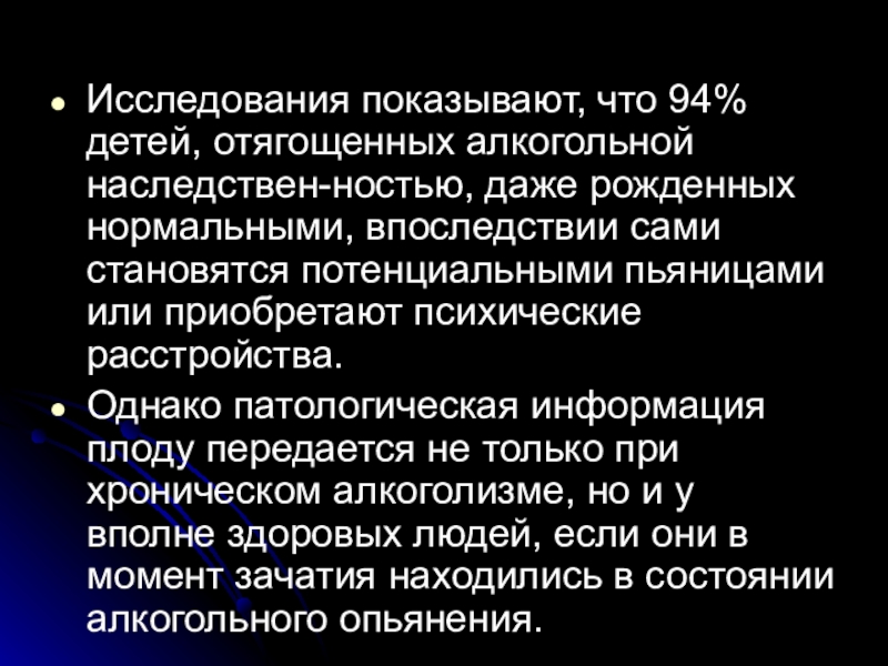 Слайд 39Исследования показывают, что 94% детей, отягощенных алкогольной наследствен-ностью, даже рожденных нормальными,