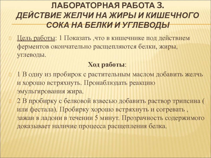 Цель работы: 1 Показать ,что в кишечнике под действием ферментов окончательно расщепляются белки, жиры, углеводы.