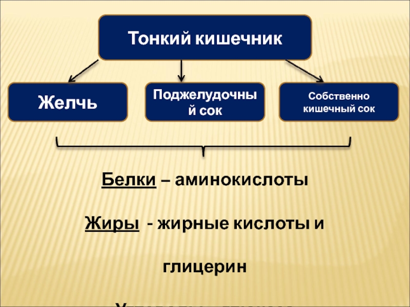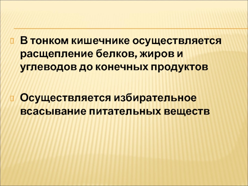 Слайд 19В тонком кишечнике осуществляется расщепление белков, жиров и углеводов до конечных