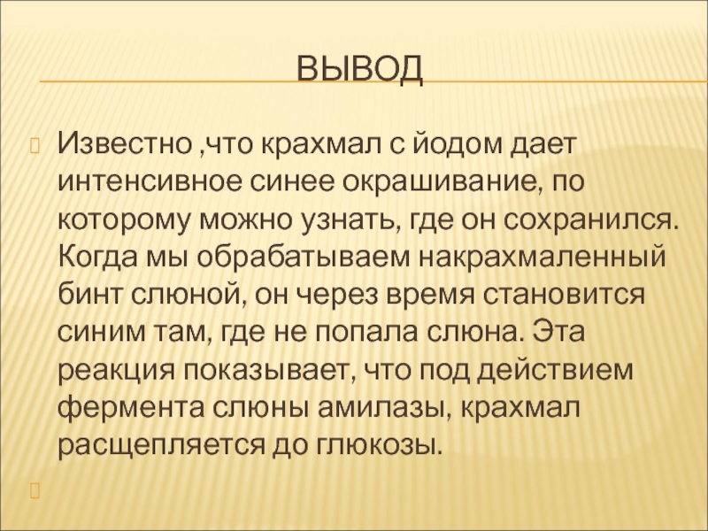 можно узнать, где он сохранился. Когда мы обрабатываем накрахмаленный бинт слюной, он через время становится синим там, где не попала слюна. Эта реакция показывает, что под действием фермента слюны амилазы, крахмал расщепляется до глюкозы.