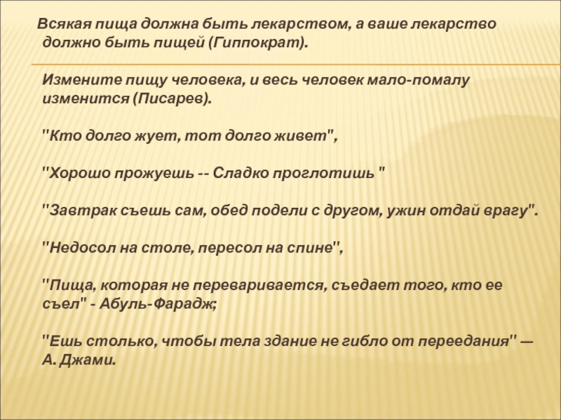 Слайд 10 Всякая пища должна быть лекарством, а ваше лекарство